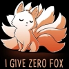 Description: Cartoon drawing of a nine tailed Fox, or kitsune, with the caption of "I give zero fox"
